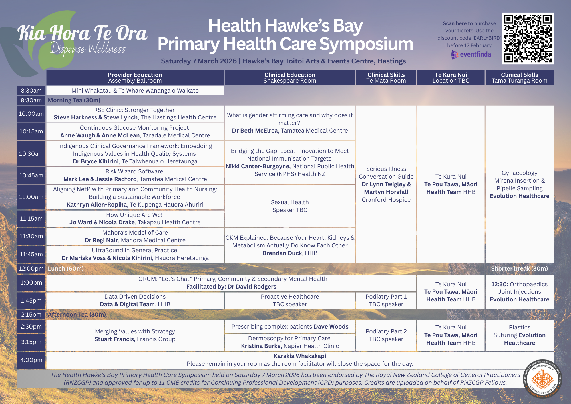 Our Symposium begins on 6 March with a Business Breakfast featuring plenary speakers, sizzling hot food, and a chance to network amongst Hawke’s Bay Primary Healthcare staff.